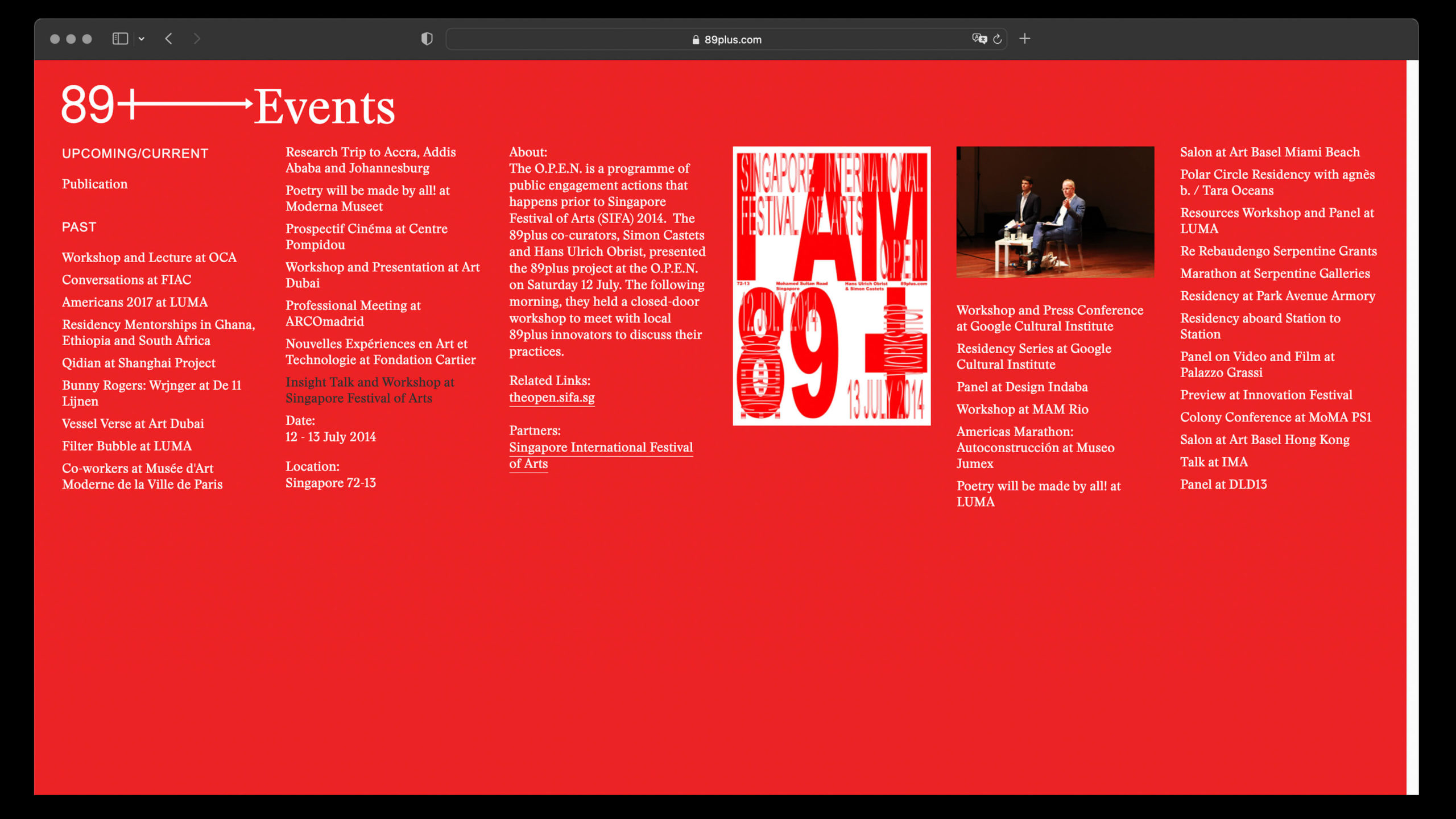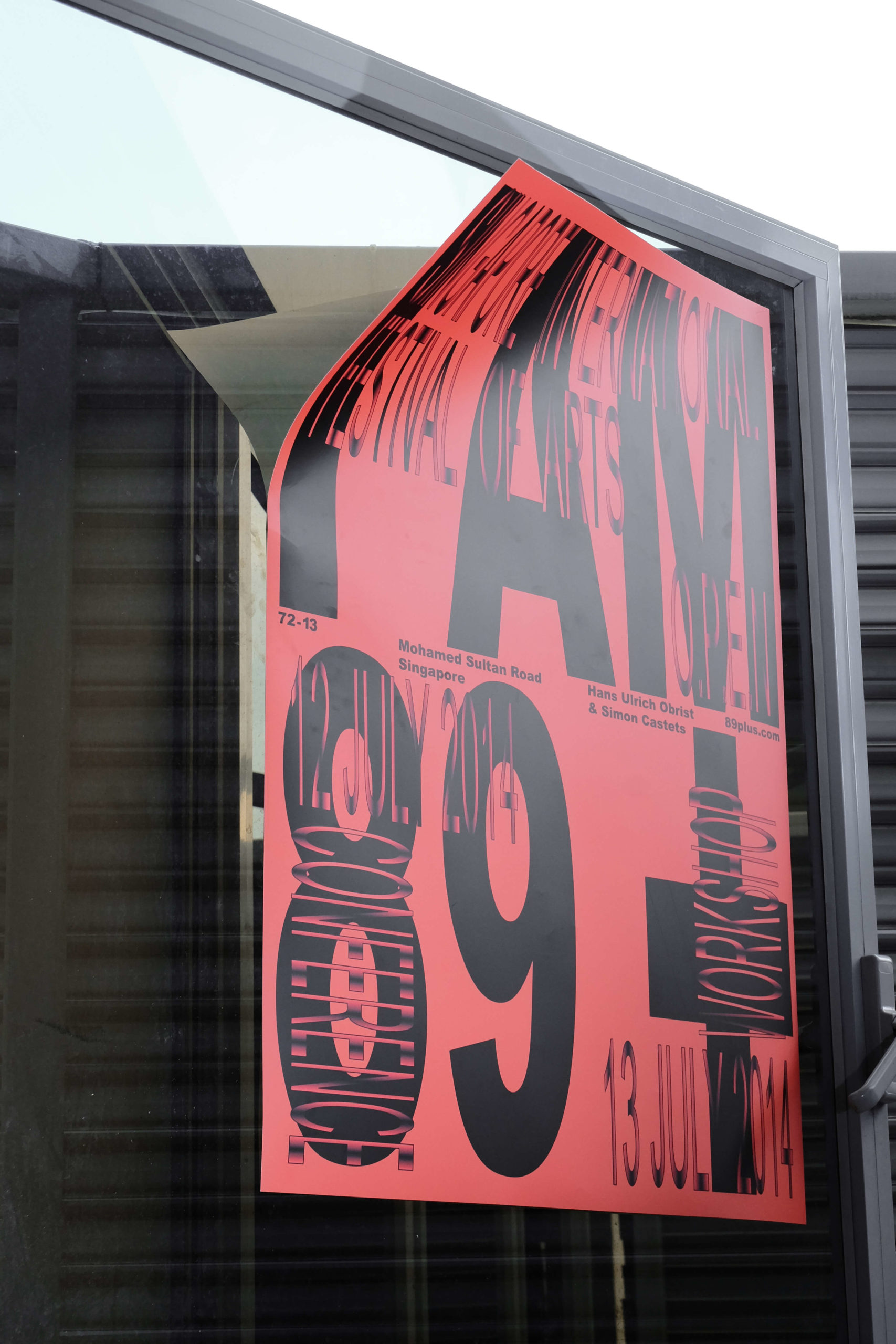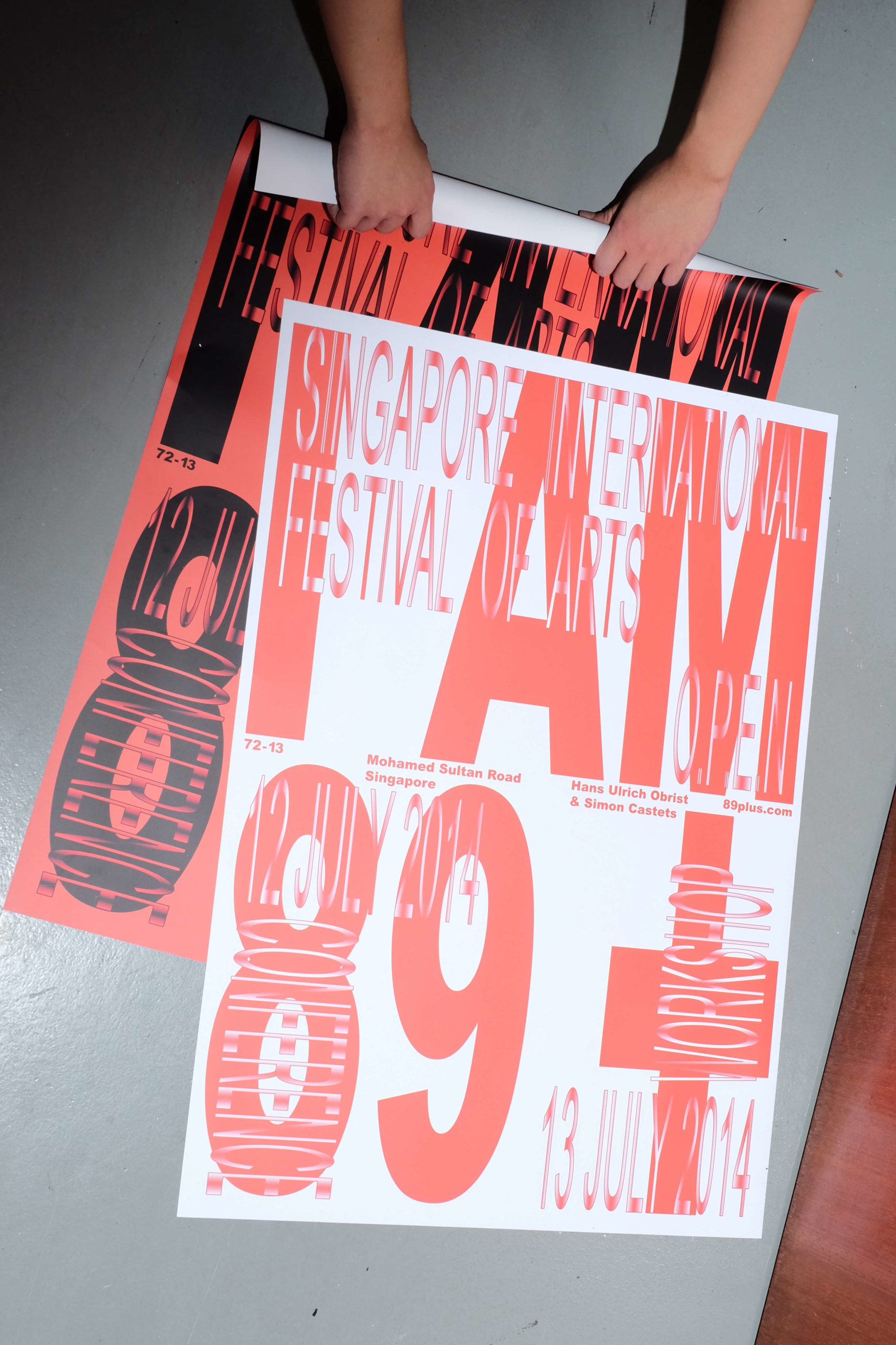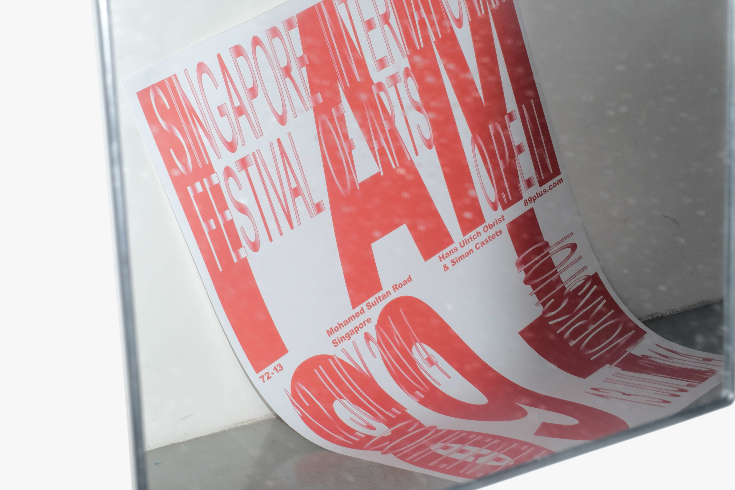 commissioned the studio to design a poster for 89plus’s (Simon Castets and Hans Ulrich Obrist) talk and closed-door workshop at the Singapore International Festival of Arts O.P.E.N programme in 2014.